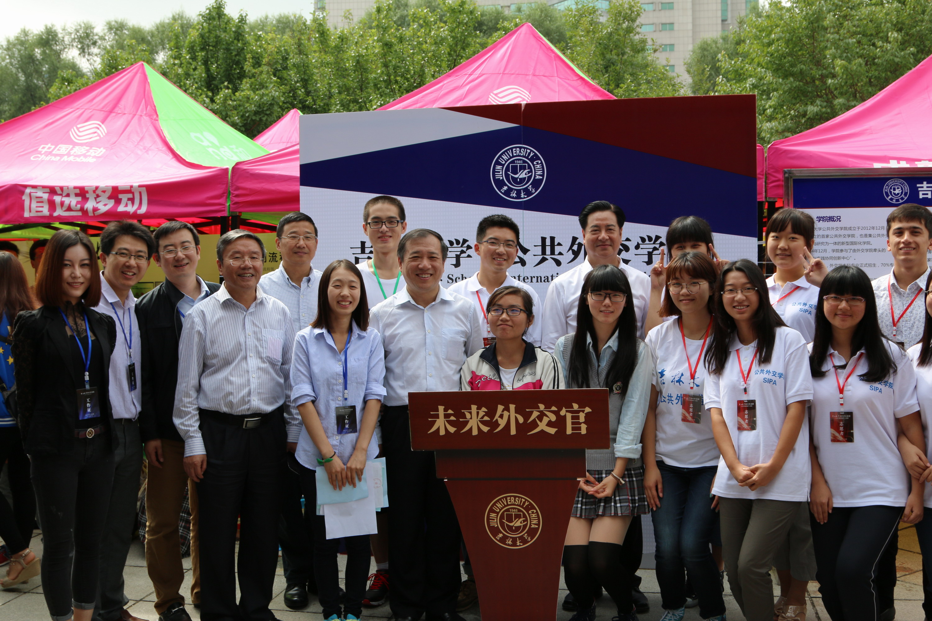 宣传板前摆放着印有“未来外交官”字样的模拟演讲台,新生在这里合影留念,记录大学“初印象”。