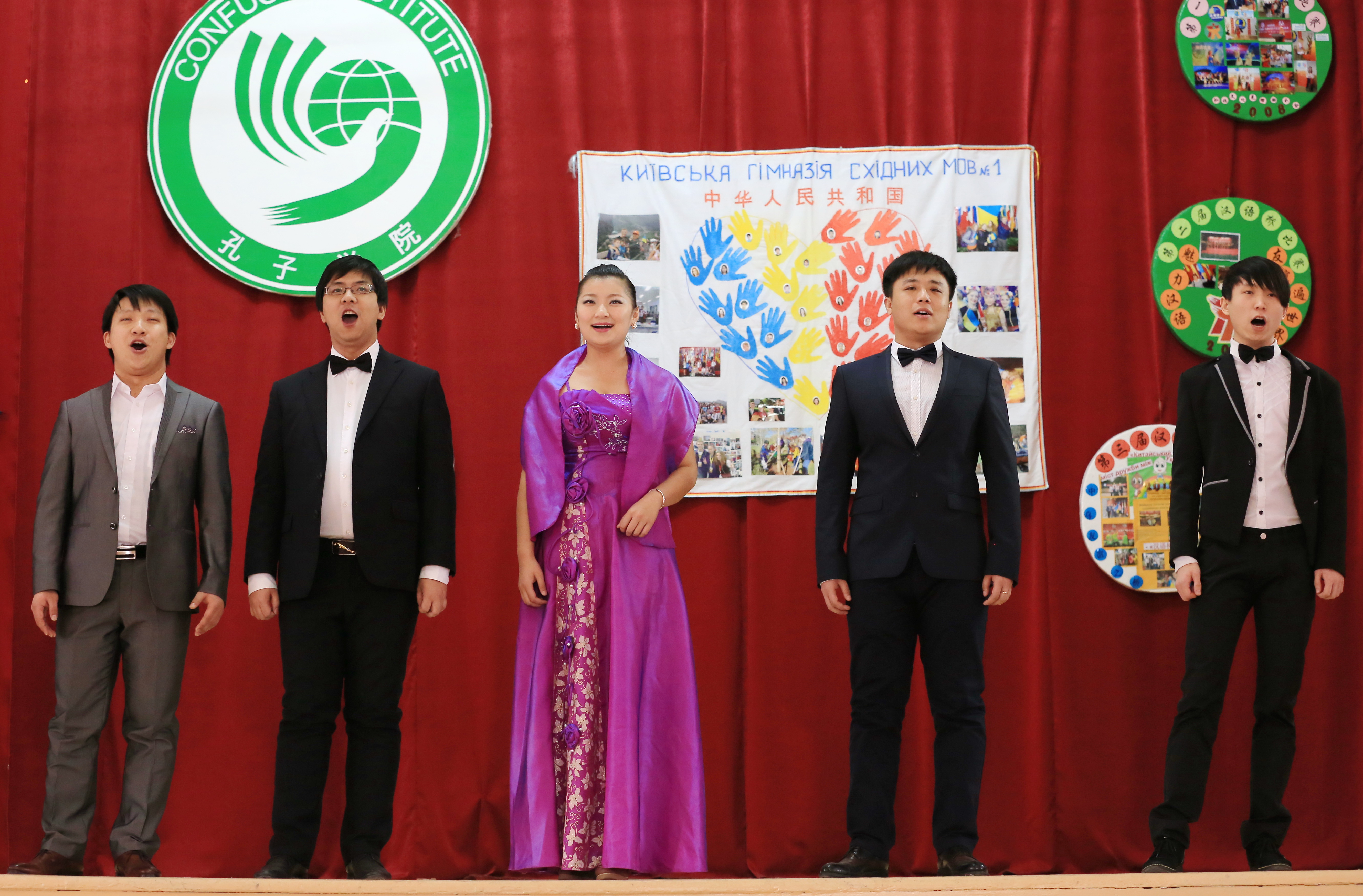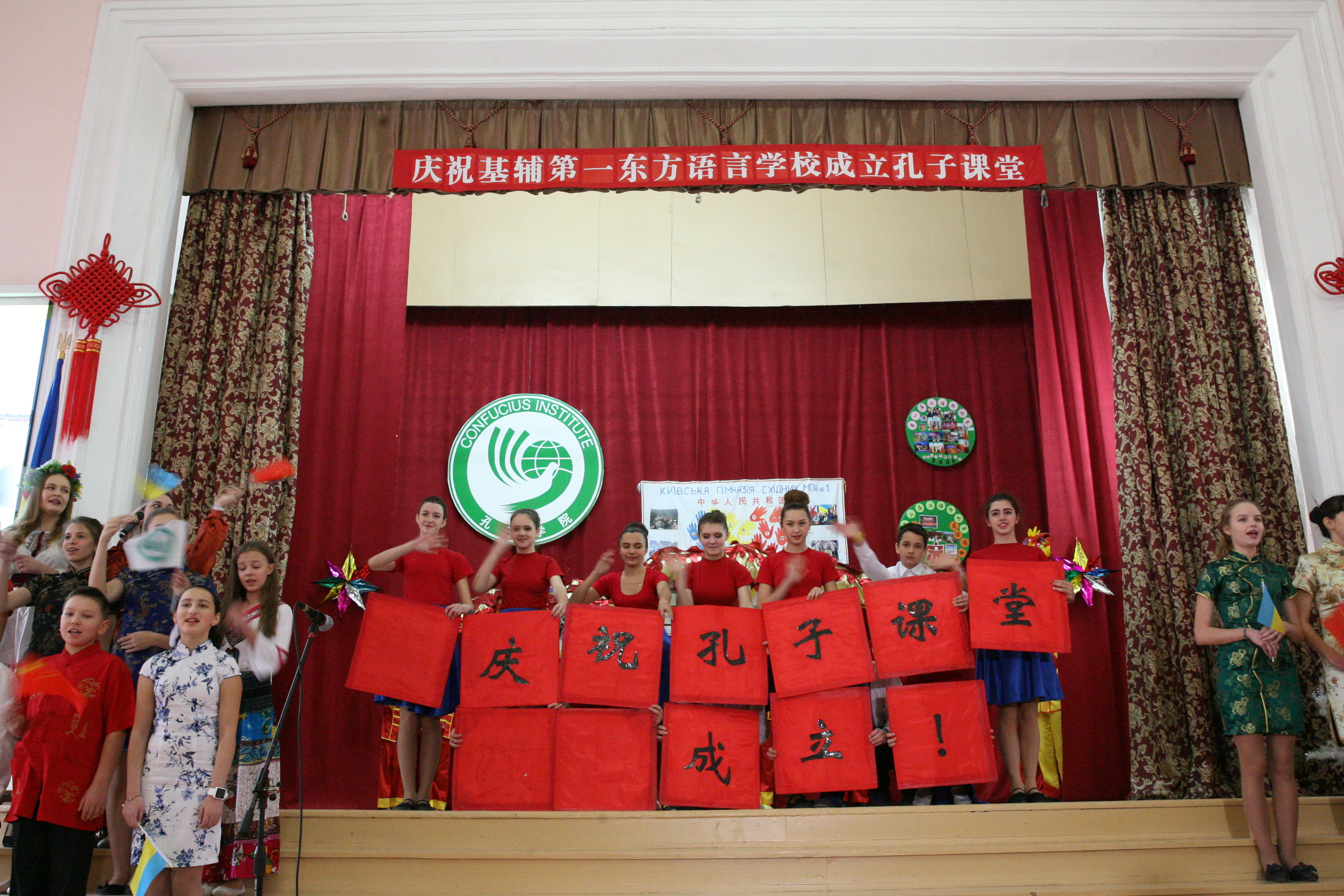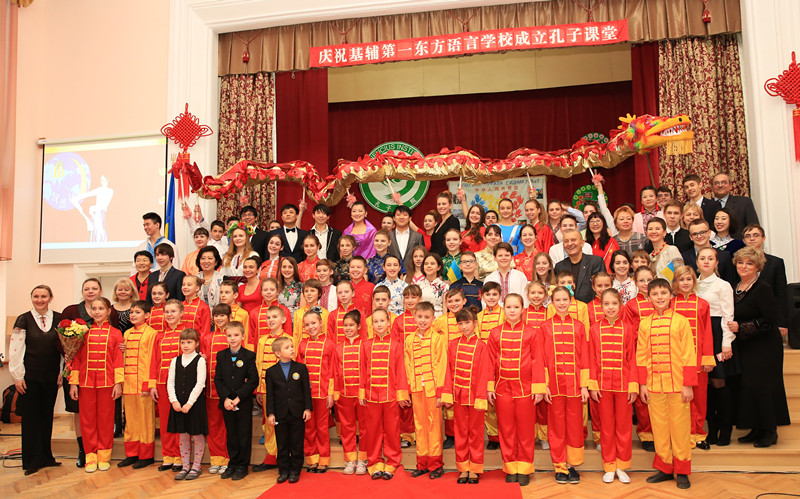 乌克兰基辅国立大学孔子学院下设孔子课堂揭牌仪式在基辅第一东方语言学校礼堂举行。中国驻乌克兰大使馆文化处负责人张艳波、乌克兰华商会会长李相、乌克兰工商联合会总经理关羡梅、基辅教育局局长叶莲娜、施韦拖申区区教委主任安娜和乌克兰基辅国立大学孔子学院中方院长李红出席了揭牌仪式。