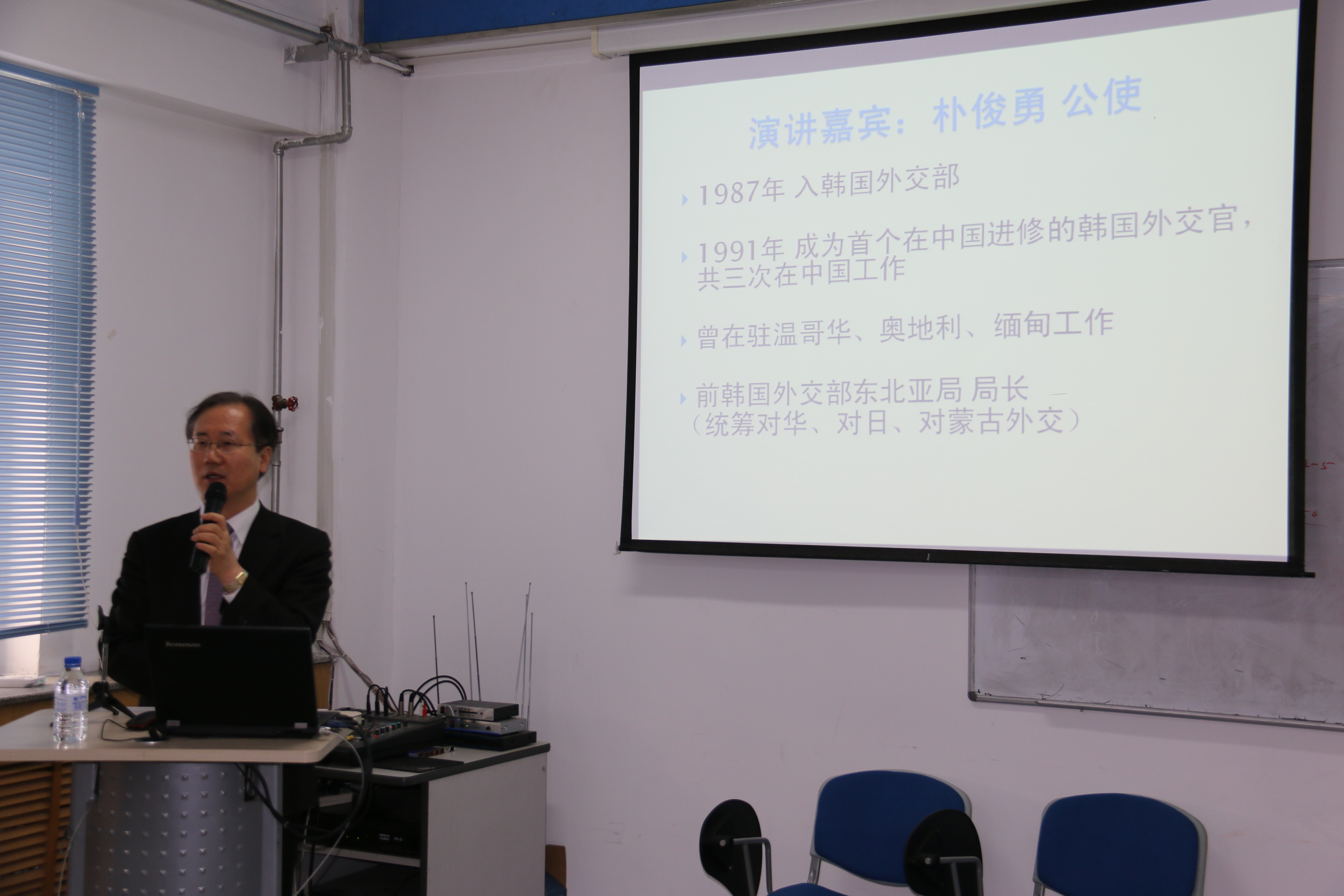 12月22日,韩国驻华大使馆朴俊勇公使来到亚洲av,面向外交学专业本科生做了主题为“现代韩国的形成及中韩关系之评价”的专题报告,报告由王秋彬副院长主持。