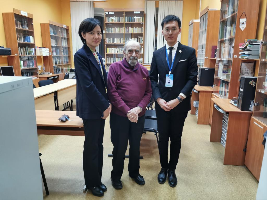 座谈结束后,调研团组同学分两组观摩梁赞国立大学孔子学院的课堂教学,分别是俄方扎普鲁德诺娃老师讲授的初级班汉语课程和中方志愿者教师魏榕辰讲授的高年级汉语实践课程。两位老师教学经验丰富、了解俄罗斯学生的特点、讲授内容生动形象,课堂气氛活跃。与此同时,乔蕊老师、刘治宸同学则在单妮娜院长陪同下拜访了梁赞国立大学德高望重的雅·玛·科尔格尔教授,他在梁赞国立大学孔子学院发展中发挥了重要的作用,双方进行了友好亲切的会谈。