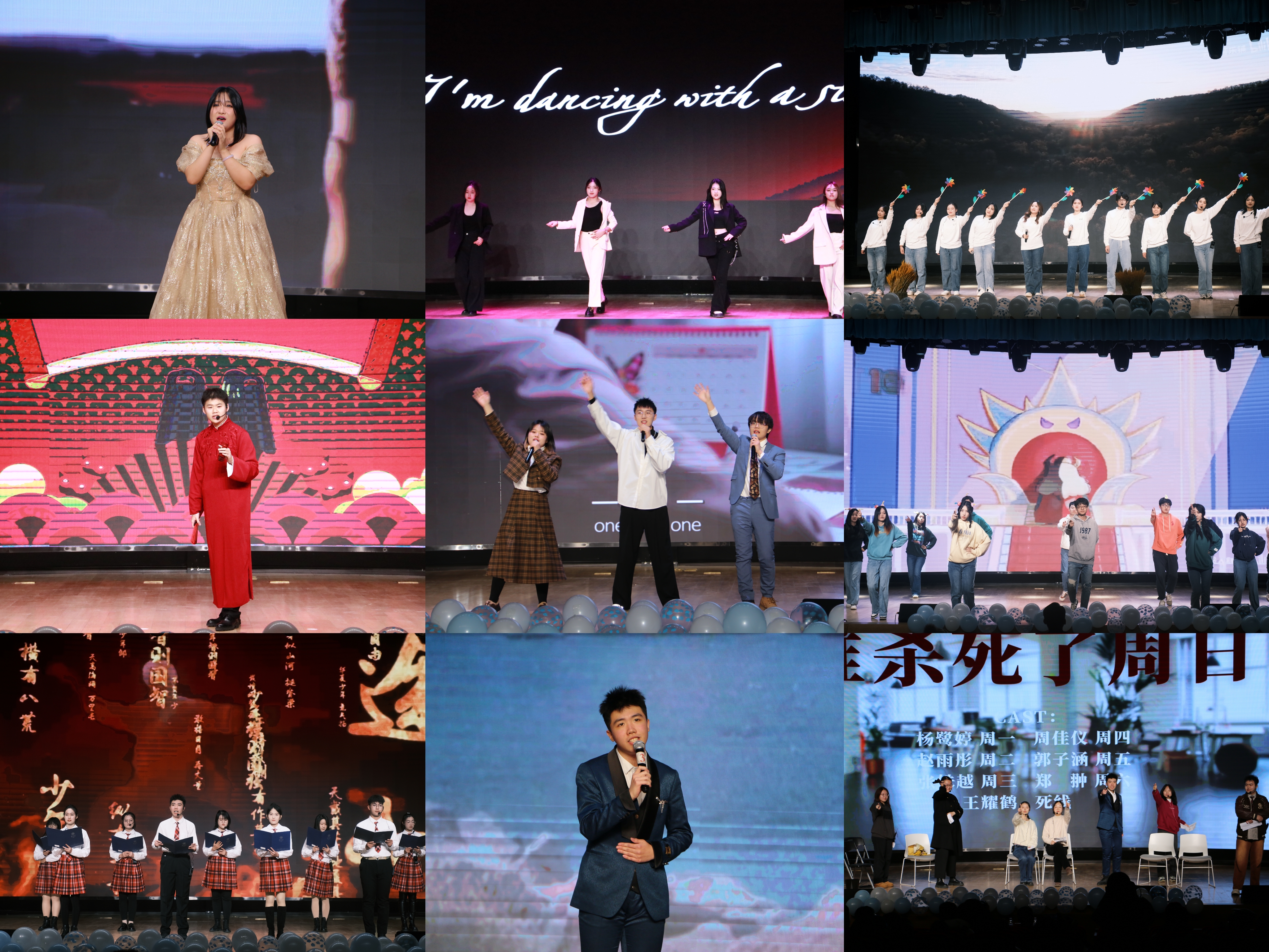 舞台灯光聚集,Crush舞团的开场舞《MANIAC》闪亮登场。节奏强烈的音乐,动感张扬的舞姿,点燃全场。郑翀演唱的《富士山下》以及团学主席团和部长们带来的《稻香》动人心弦,他们用温暖的歌声再现刻在唱片里的时代记忆。天苍苍,野茫茫,孟翔冲老师用矫健的舞姿讲述来自蒙古草原《天边》的故事。舞蹈《Dancing with a stranger》、《Ilusion & Perfect Night》以及《舞动快乐青春》律动青春节奏,舞出闪耀光芒。宋奇翰打着快板《说点儿》,希望大家“幸福靠近点儿,烦恼走开点儿”。小品《谁杀死了周日》将时间拟人化,用幽默风趣的方式启示大家珍惜时间、拒绝拖延,收获了观众们的阵阵欢笑。乐器演奏与独唱《这世界那么多人》旋律动听,一句“多幸运,我有个我们”启迪我们“遇见即是幸运”。扫动琴弦,吉他弹唱《星瓷》温情舒缓,展现音乐温婉的美。合唱《少年他的奇幻漂流》与《最美的期待》借歌声传达少年期冀美好未来,终载星河航向未来。诗朗诵与独唱《少年中国说》诠释着中华民族自强不息的精神品格,彰显了身为新时代青年所担负的使命与担当。中阮演奏《丝路驼铃》呈现出的浓郁民族风情,使现场观众置身于千年前的丝路旅途之中;琵琶声清亮悠扬,一首《彝族舞曲》如同大地的鼓动,唤起了万物的欢欣。《路过人间》《肖邦A小调四舞曲》《凌美地》三首歌曲的串烧,将人声与琴声完美融合,把现场的艺术氛围与情感共鸣提高到一个新的境界。伴随全场热烈的掌声,晚会在留学生的民族舞蹈《Pushdo Attan》中接近尾声。