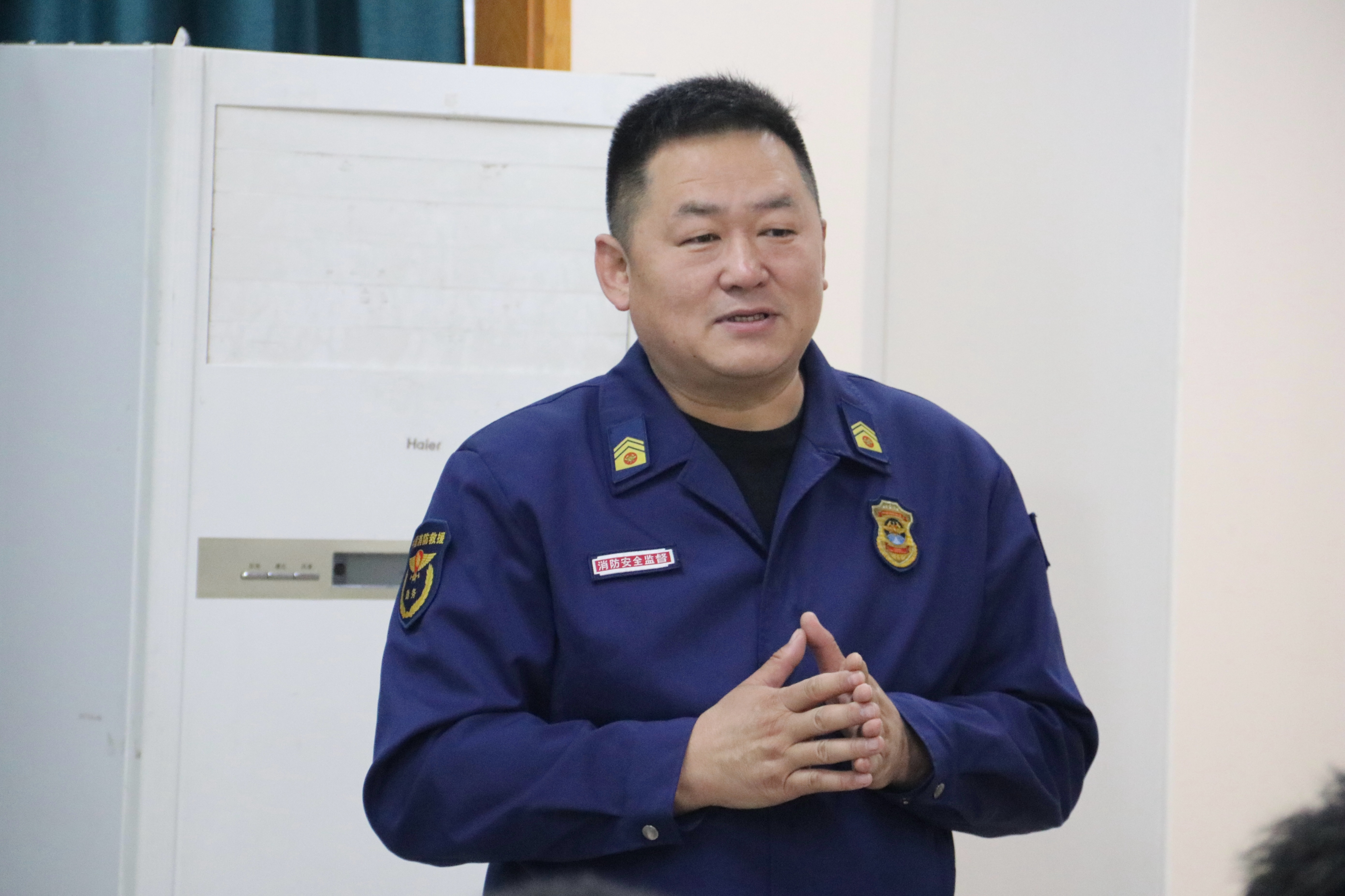保卫处消防科科长董立明老师做专题培训及演练指导,亚洲av30余名教师及2024级本科生代表参加其中,活动由行政副院长于洪生主持。