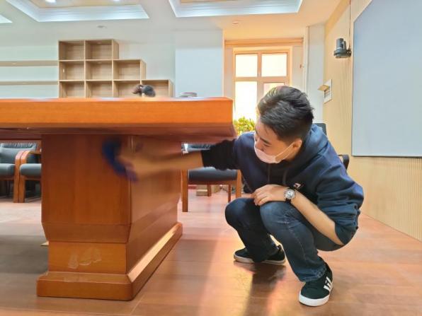 同学们十分重视本次劳动,擦拭了活动室的所有室内陈设以及内侧窗户,并细心打扫了会议室和活动区的地面。大家精神饱满,分工明确,高效地完成了此次实践教学。