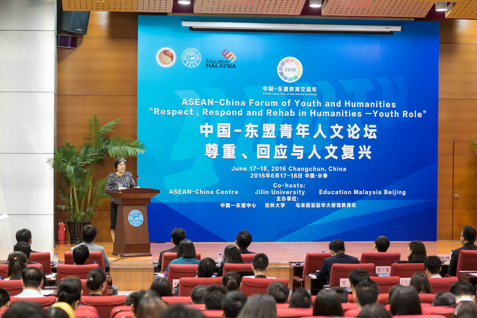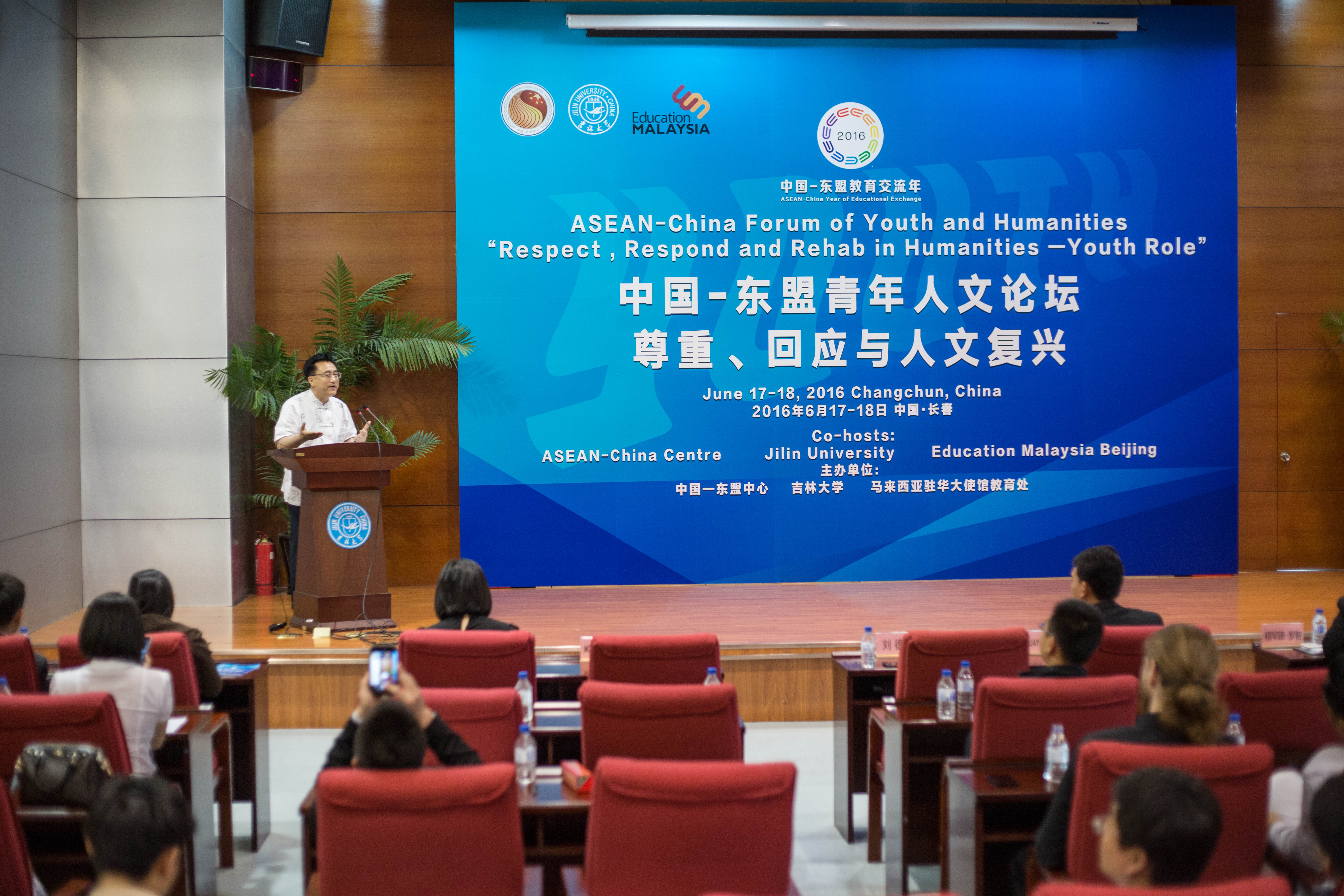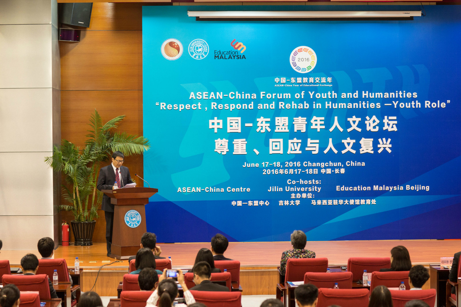学术报告厅隆重举行,开幕式首先播放了在长春学习的东盟国家留学生视频,分享了他们在中国学习与生活的感悟与体会。杨秀萍秘书长、陈岗常务副校长、老挝驻华使馆教育与文化处一等秘书本恒·西哈拉分别致辞。随后,来自中国与东盟国家的青年学生在开幕式上共同奉献了一场颇具各国文化特色的文艺演出。在主题发言环节,马来西亚驻华使馆教育参赞穆罕德·罗智博士(Mohd Rozi)和暨南大学国际关系学院教授、海国图智研究院院长陈定定教授分别做了题为《东盟青年—走向21世纪教育的愿景与使命》和《增进中国-东盟关系发展:青年人视角》的主题发言。