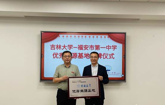 优秀生源基地”牌匾。陈雄校长与于洪生副院长就学校生源、人才培养、报考情况等亲切交流并合影留念。