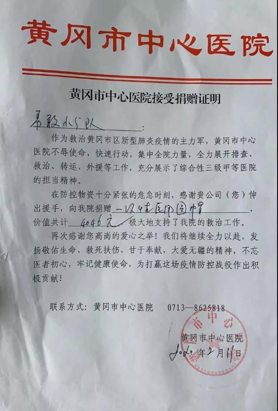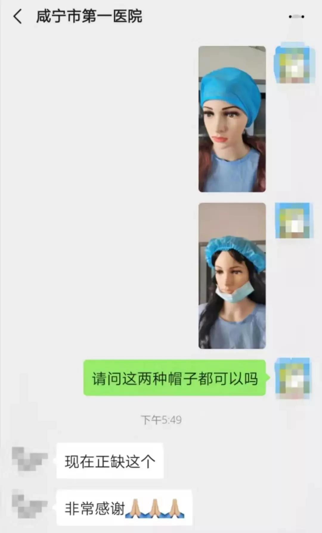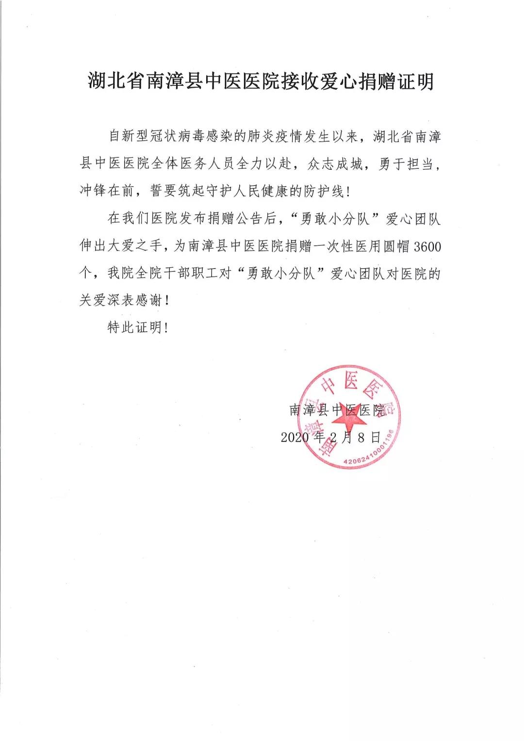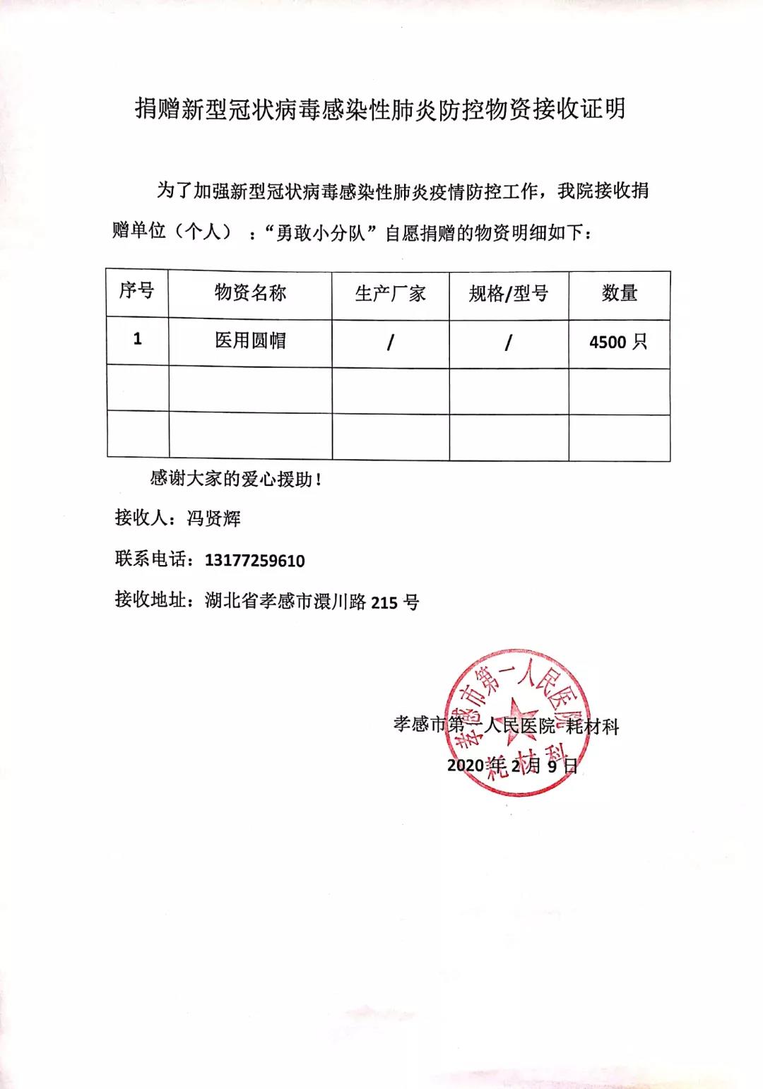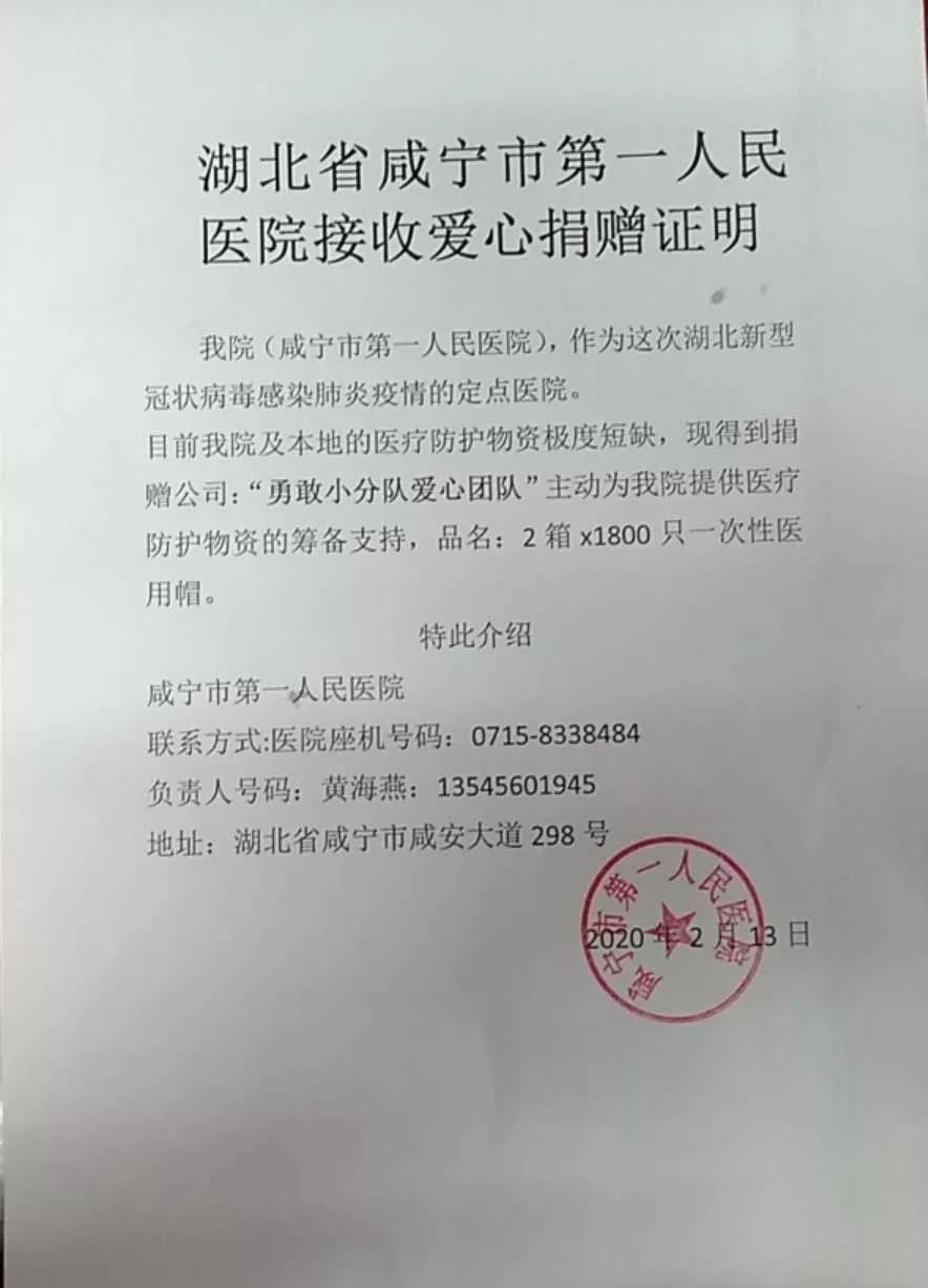 最终三名同学以“勇敢小分队”的名义代表所有的捐款者为黄冈市中心医院、孝感市第一人民医院、咸宁市第一人民医院、襄阳市南漳县第一人民医院共计捐赠一次性医用圆帽16200顶。