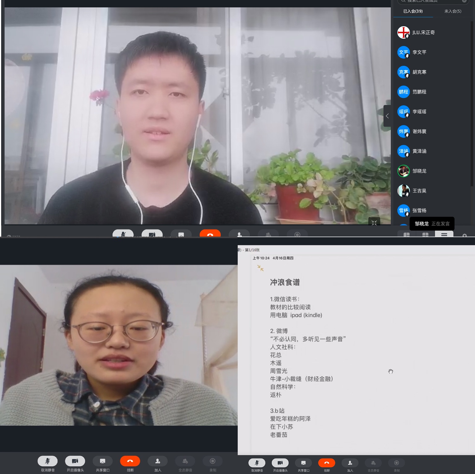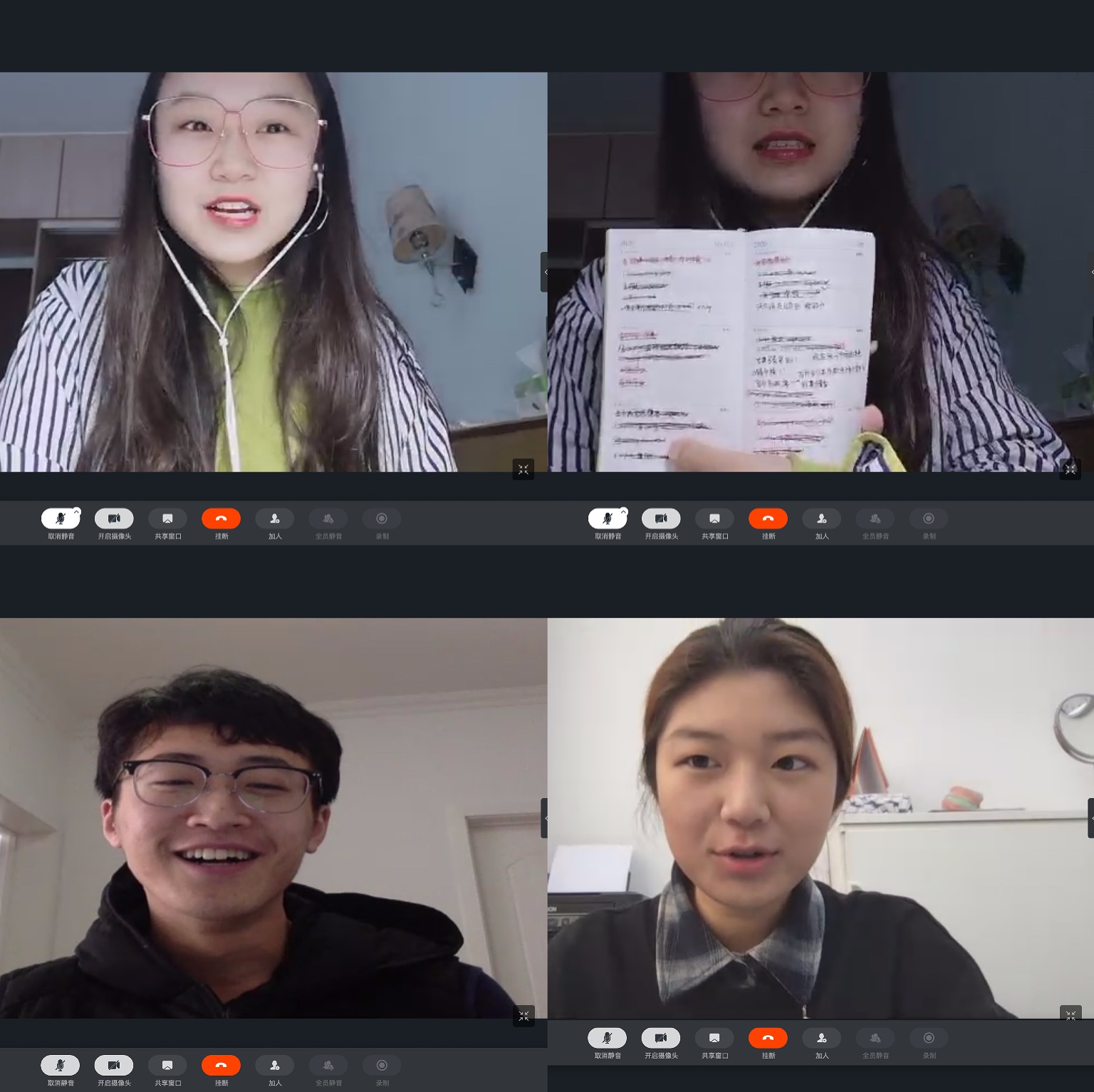 赵宇玺在谈到面对上网课期间很多任务的情况下,我们可以用一个本子来记录当天需要完成的事情,防止疏漏。张词含同学为我们讲述了当面临拖延症时,我们应该和同学们一起学习,互相督促,并养成健身的好习惯。信思涵同学则是提到了网课期间学习效率更高,在上网课时,我们可以重复播放我们没有理解的部分,便于加深我们的印象,并且和大家分享记笔记这种可以集中注意力的方法。