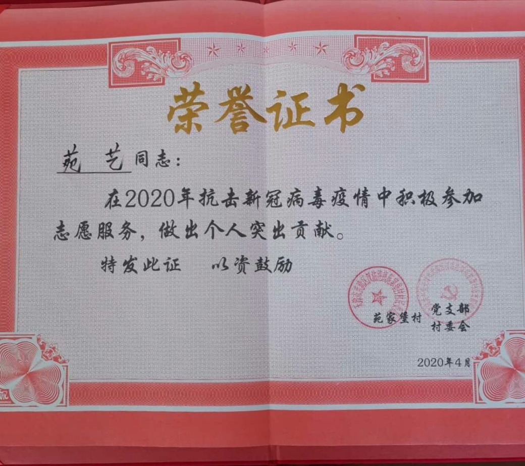 作为新时代的大学生以及一名积极分子,苑艺同学在此次工作中认真负责,为家乡防疫奉献出了自己的一份力量。正值“五四”青年节之际,苑艺同学作为青年一代,在家乡的防疫工作中不断发扬着热爱祖国、积极进取的“五四”精神。