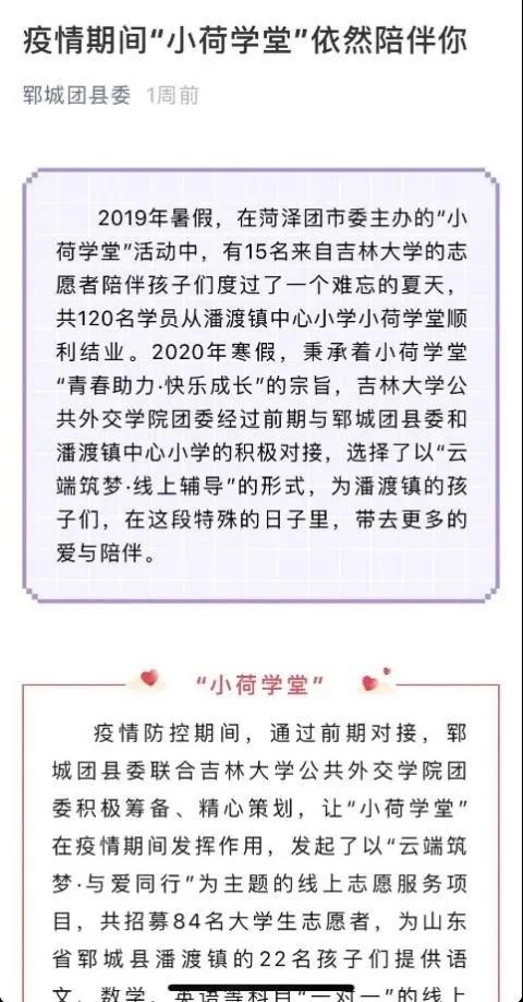 本项目既是对支教地学生线上学习的有益补充,又是对“互联网+志愿服务”的一次积极探索,获得了来自学生、家长及社会的多方肯定。山东省郓城团县委在3月13日于微信公众平台发布“疫情期间,‘小荷学堂’依然陪伴你”推文,对本次活动进行了专题报道。山东省郓城县潘渡镇中心小学专门向亚洲av