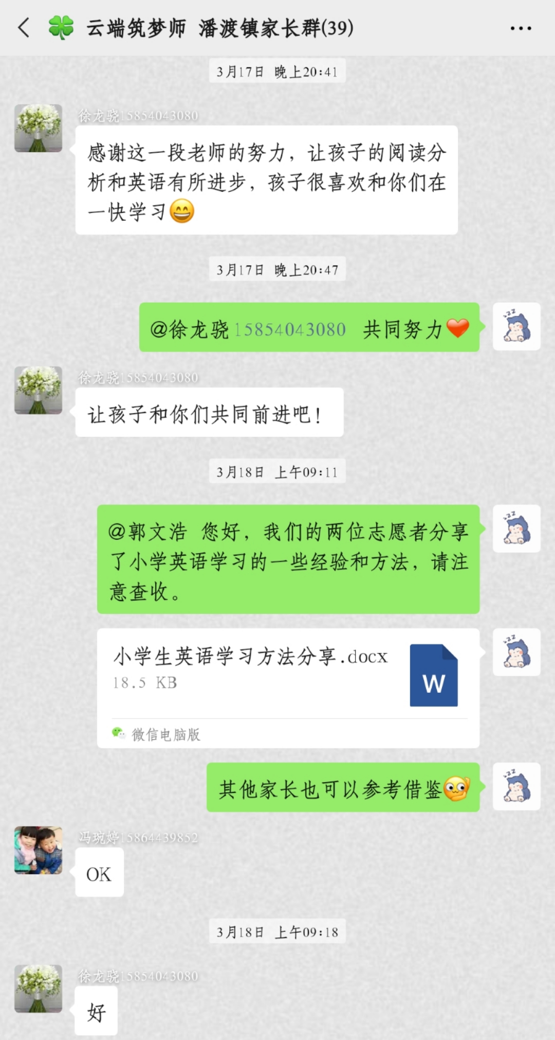 千里云端,共筑一梦。从2月27日至4月8日,共有来自全校17个学院的96名志愿者,以腾讯会议、钉钉等软件为媒介,为3两地的孩子们开展一对一的线上课业辅导。志愿者们根据课程安排,提前与学生和学生家长取得联系,根据每个学生的学习情况及实际需要,精心设计辅导内容,并在志愿者交流群中共享课程资料、交流辅导心得。活动工作人员定期与学生家长取得联系,了解线上辅导开展情况,并根据学生体验及家长反馈不断调整活动细节,优化活动效果。活动结束后,主办方组织开展主题征文活动,鼓励志愿者写下“云端筑梦”过程中的所思所感,并剪辑纪念视频,在学院微信公众平台上对本次项目进行及时有效的报道与宣传。
