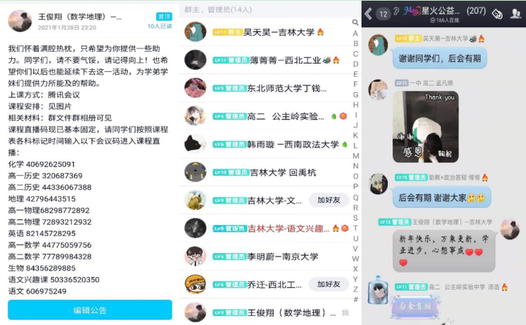 、东北师范大学、西北工业大学等多所高校的学生纷纷加入,最终由16人组成了一个完整的教师团队。王俊翔和陈信亚同学担任数学、地理和语文兴趣课程的授课老师。团队秉持“疫情虽然严峻,学习不能停止”和“公益课堂,全部免费”的原则,坚持从学生本位出发,充分考虑学生的作息安排,妥善安排了课程表,并且通过“知识点总结”“学习经验分享”“答题技巧优化”三个方面、课程和答疑两个维度的努力,为高中学子们提高学业奉献了自己的一份力量。