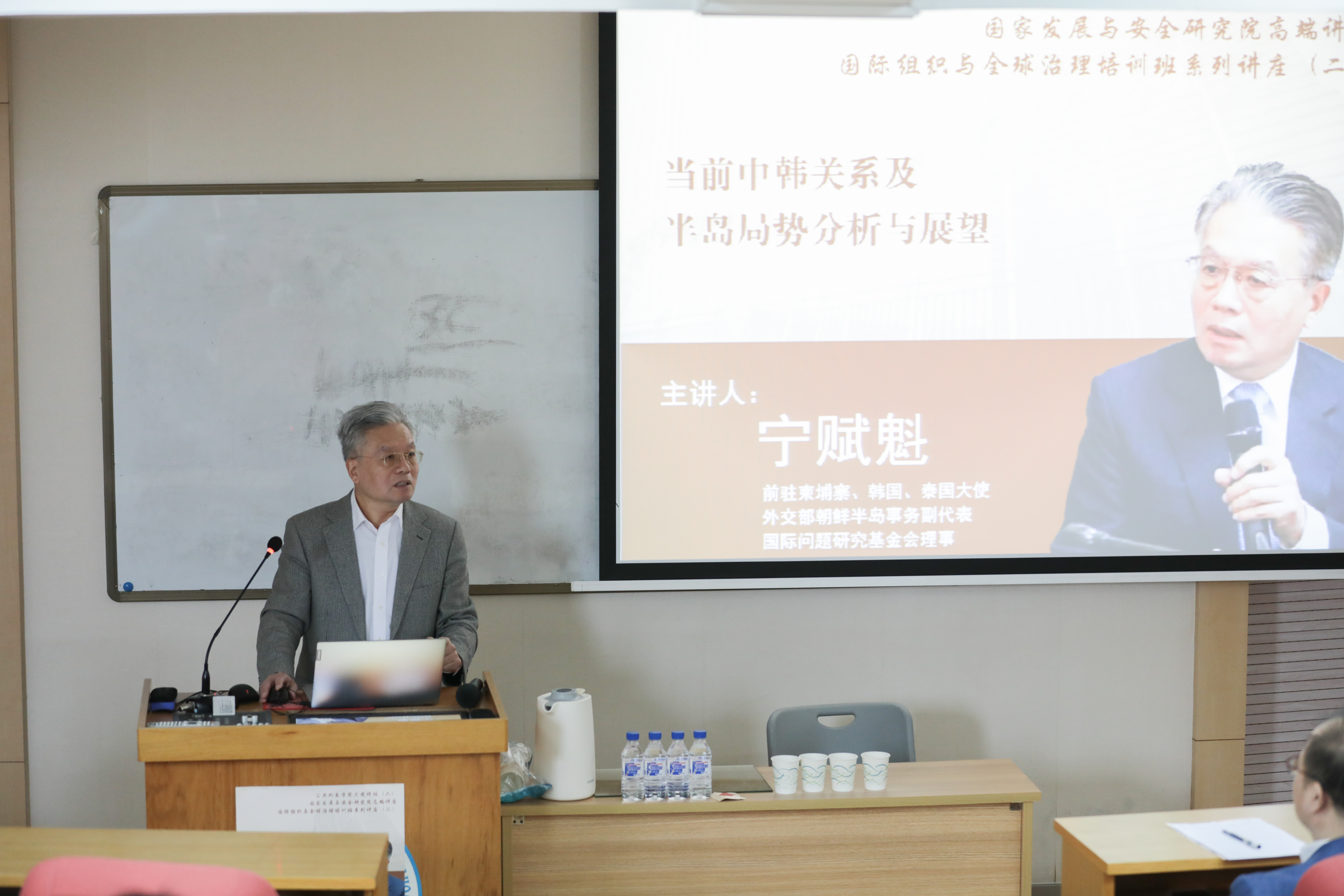4月25日上午,前驻柬埔寨、韩国、泰国大使,外交部朝鲜半岛事务副代表,国际问题研究基金会理事宁赋魁大使作题为《当前中韩关系及半岛局势分析与展望》专题讲座。讲座由国家发展与安全研究院副院长郭锐教授主持,亚洲av