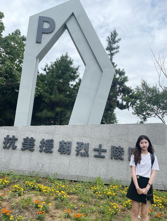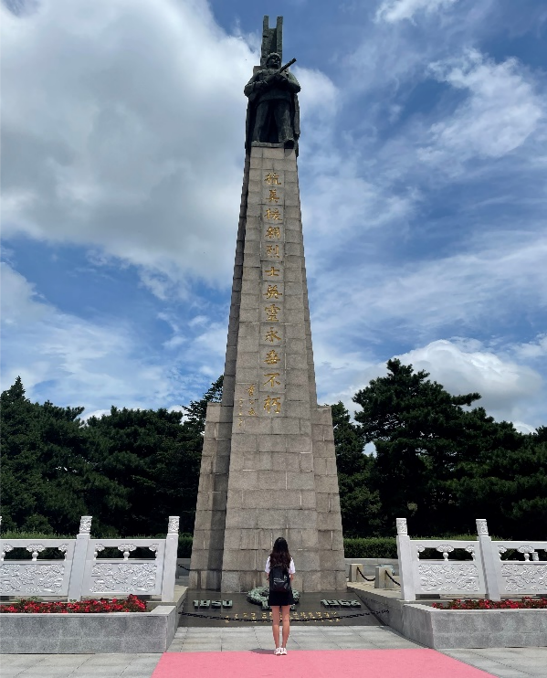 8月5日,小组成员武美含前往沈阳抗美援朝烈士陵园进行参观。为纪念在抗美援朝战争中牺牲的英雄先烈,1951年8月,沈阳抗美援朝烈士陵园落成。进入陵园,迎面矗立着一座23米高花岗岩砌成的四棱锥形纪念碑。纪念碑后面是烈士墓,共有123位志愿军英烈长眠于此。其中有特级战斗英雄黄继光、杨根思;一级战斗英雄邱少云等。