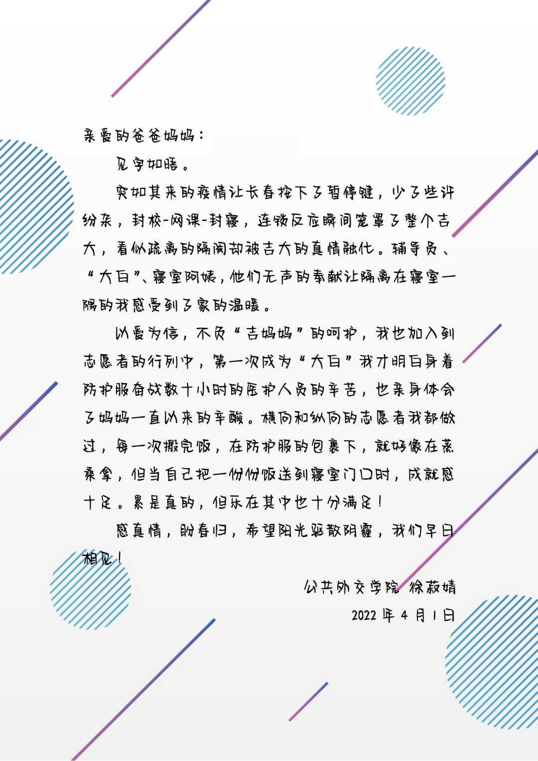 突如其来的疫情给大家正常的学习生活按下了暂停键,在封校的二十多天里,在与吉大同呼吸、共命运的二十多天里,在与老师、同学们一同抗击疫情的二十多天里,无数的思念与牵挂深埋心中,一个个情真意切的字眼,一封封绵绵真情的家书,承载着学子们赤诚的情意。我们也相信,当远方挂念着家中儿女的亲人们收到这些信的时候,心情一定是激动的、安心的。