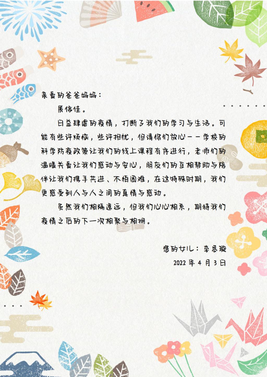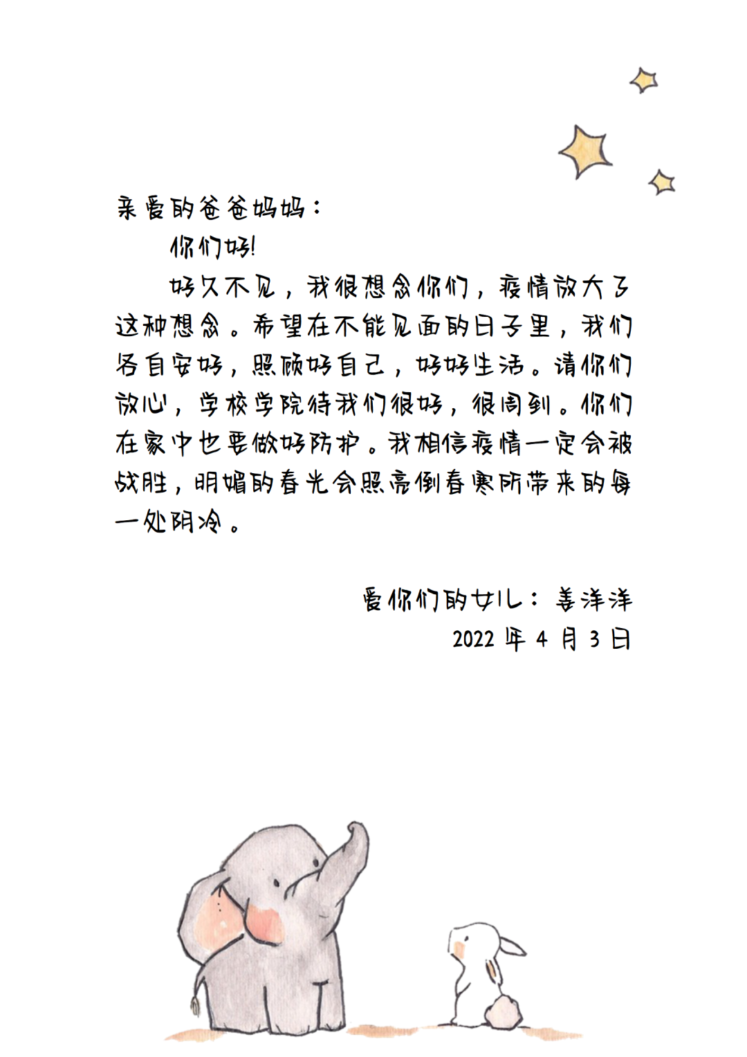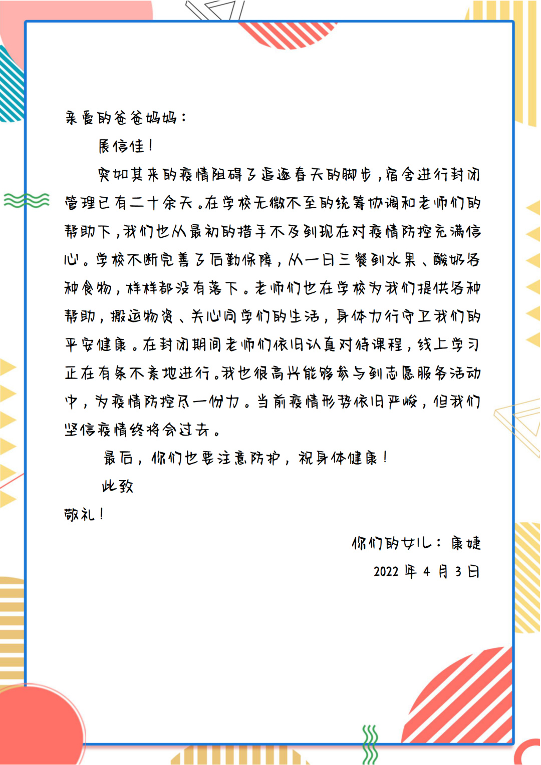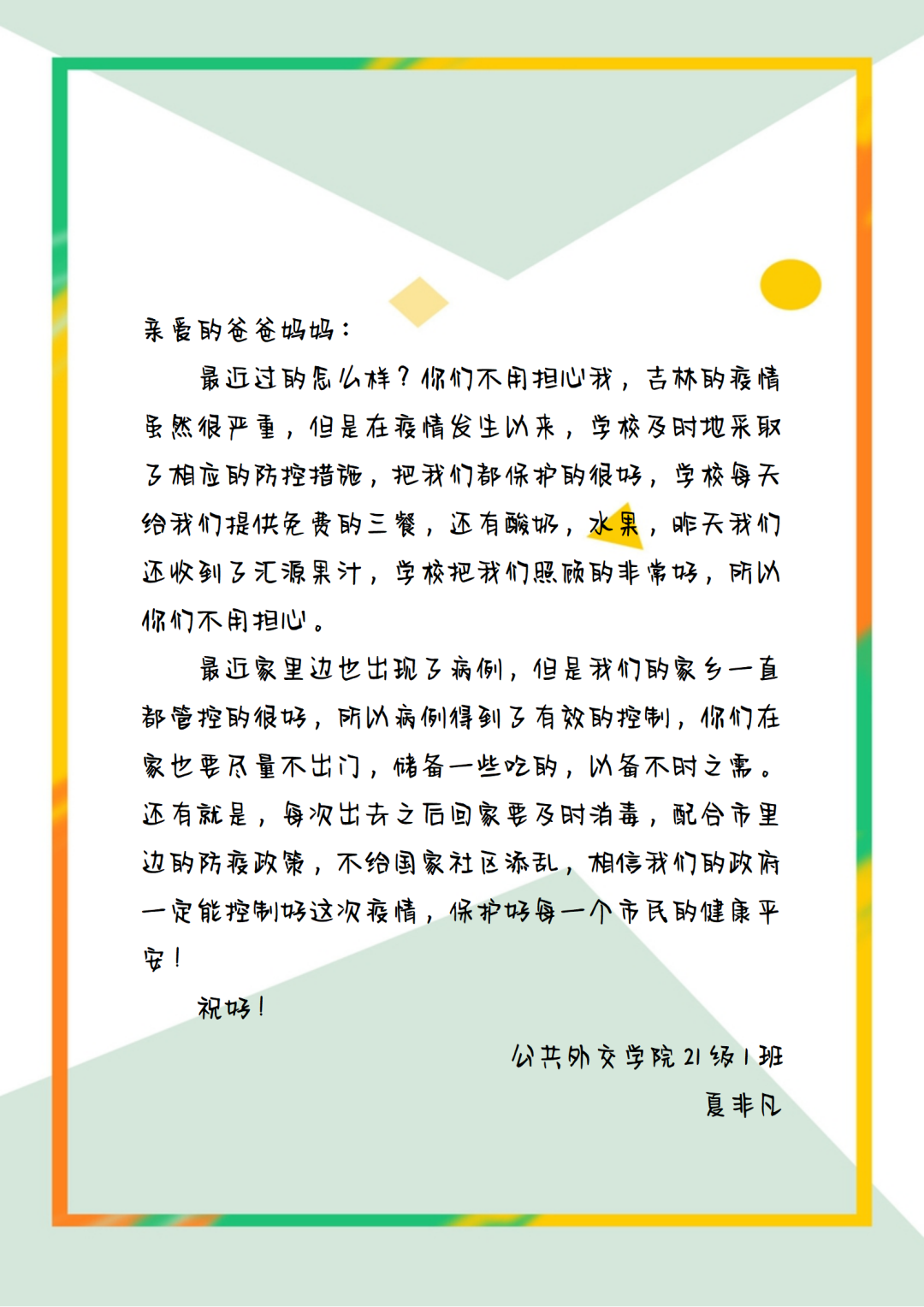 驿寄梅花,鱼传尺素,家书承载着我们对远方亲人的思念,维系着人间真情。为了弘扬传统美德,增强家校情感互动,坚定疫情防控决心,亚洲av举办了一封“家书”征集活动,鼓励外交学子们给家人写一封家书,介绍封校期间的学习生活情况,传达自己的封寝感受,分享自己的抗疫志愿活动经历。