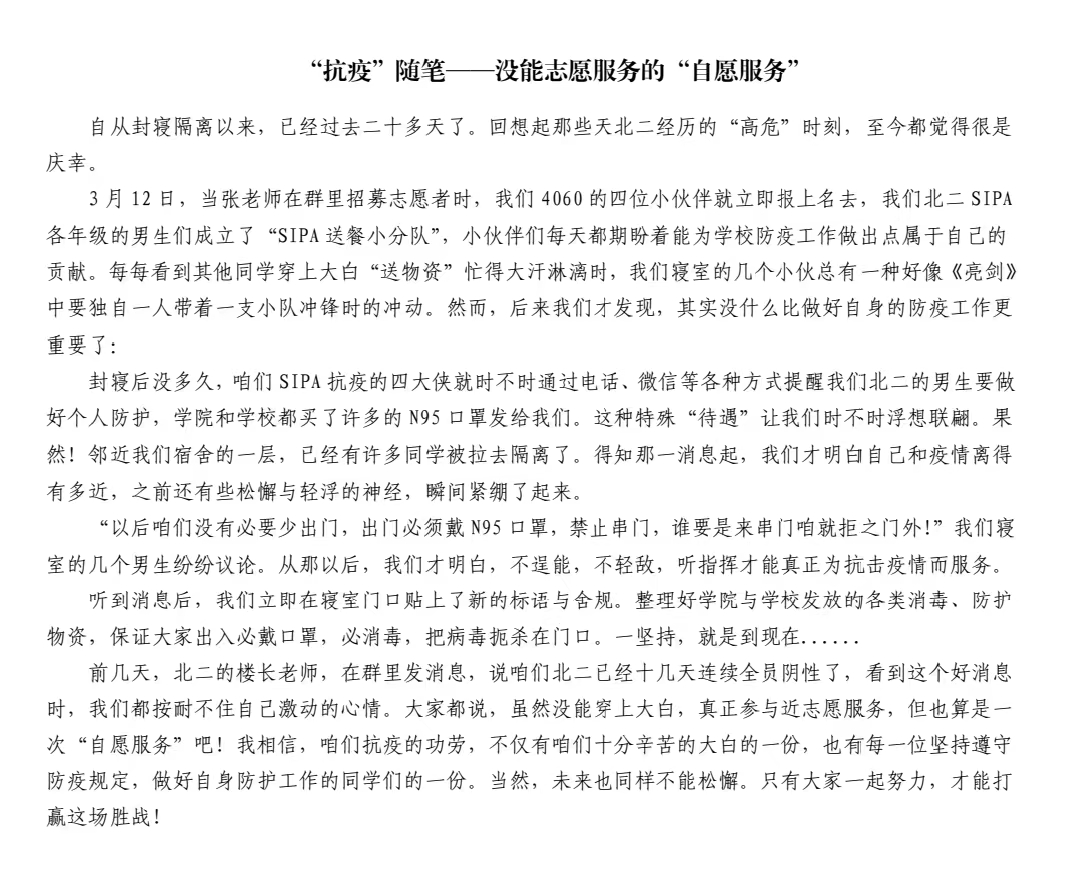 此次活动中,同学们积极响应,纷纷落笔,书写下了自己的见闻和感悟。札记虽短,却诉说着同学们内心中最真挚的情感;冬季虽长,却总有春暖花开的季节。在本次征文活动中,各年级同学们热情参与,用真诚且细腻的语言讲述着自己的经历与感受,充分表达了对所有奋斗在抗疫一线的人们的谢意和对战疫胜利的信心,展现了吉大学子热忱赤诚的家国情怀和积极阳光、奋发向上的青年风采。