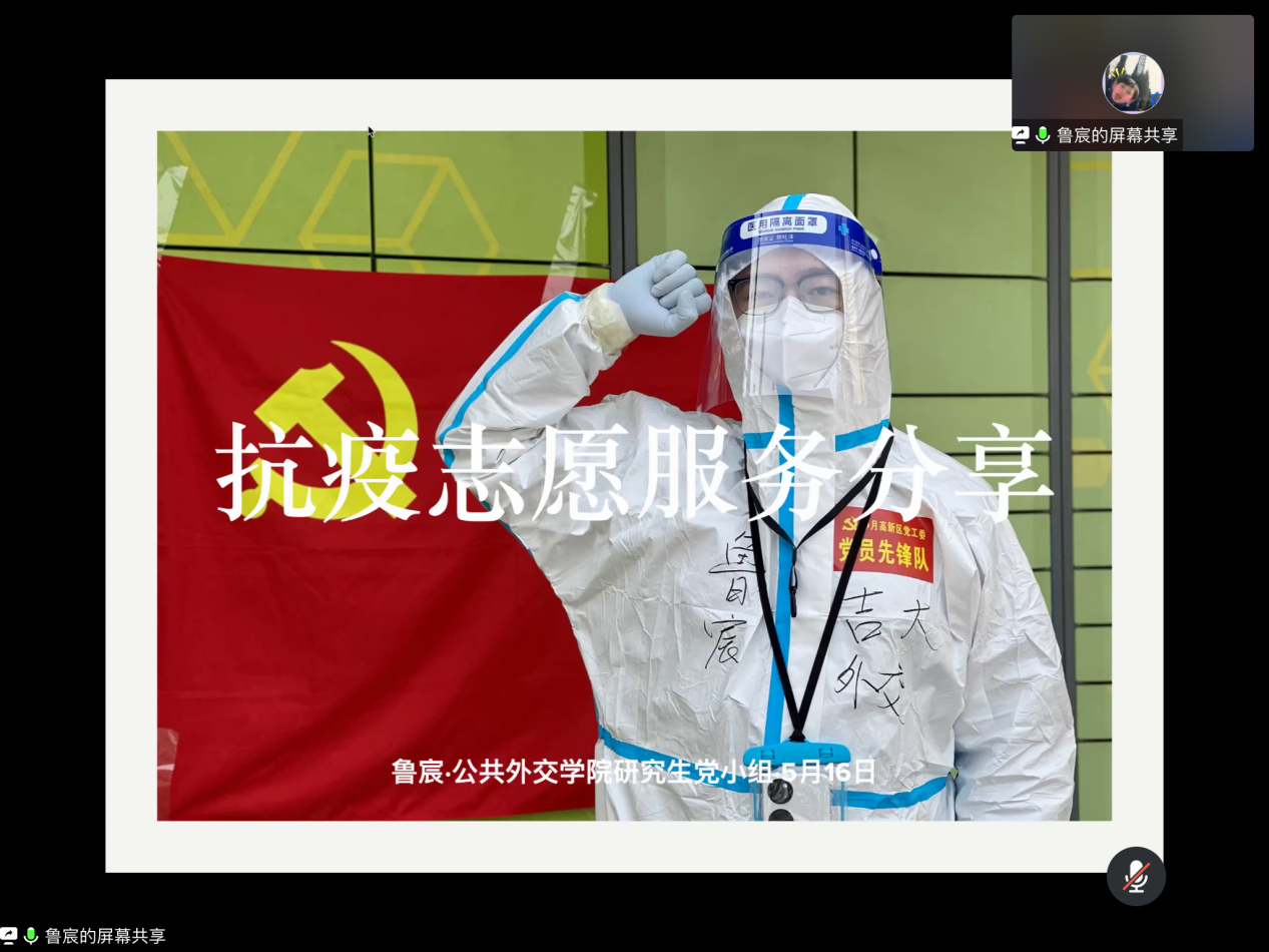 的学生党员志愿者们也用坚守和担当在战“疫”中奉献着青春力量。5月16日晚,学生党支部研究生党小组开展了开展“讲述身边抗疫故事”主题党日活动。分享会由党小组负责人梁秋军主持,党支部书记张淑艳参加。