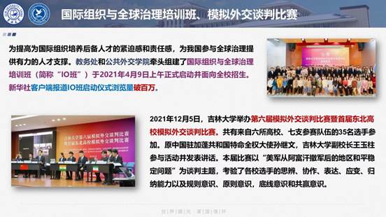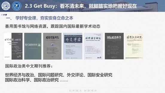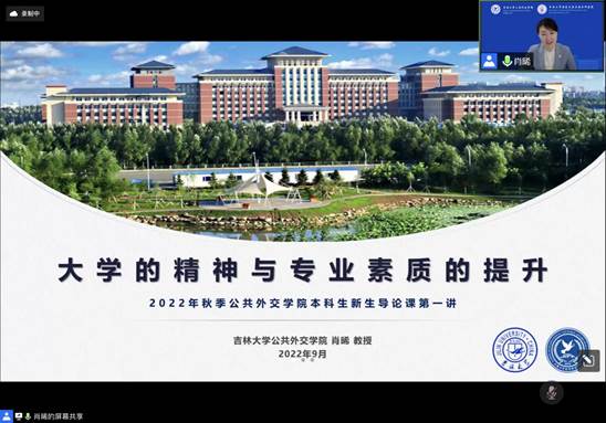 的快速发展:2021年年底,学院获得了国家安全学一级学科博士学位授权点,成为全国首批建设单位,也是东北地区唯一一家建设单位;今年6月,外交学专业获批国家级一流本科专业建设点。近年来,学院培养的一批学生顺利进入联合国等国际组织进行实习;一批优秀毕业生进入海内外知名高校深造;还有不少毕业生进入企事业单位工作,得到了业内人士的一致认可。肖老师鼓励同学们要秉持“世界眼光•家国情怀”的院训,提升多学科交融学习能力,成为具备全球视野、通晓国际规则、懂理论、能实践的复合型外交外事人才。