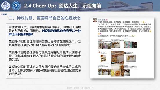 肖晞老师希望新生能“Cheer Up”,期盼学生们能够在脚踏实地的基础上志存高远,并对经历的一切困难都可以做到“宠辱不惊,去留无意”,以乐观心态创造豁达人生。她指出,进入大学面对一个新的环境时,学会调节自己的心理状态至关重要。建议同学们迷茫时读书,烦躁时运动,独处时思考。尤其是在疫情防控这段特殊时期中,更是要学会调整自己的心态。“世事无常,而爱恒常”,她鼓励同学们要乐观面对学习与生活,以高昂的姿态直面人生挑战。同时她强调,养成良好的生活习惯也至关重要。在疫情防控依然任重道远的情况下,同学们更应当注重自我身体健康,平时注意保持整洁的生活环境,饮食方面也应做到健康有规律,要以强健的体魄促进精神的强大。