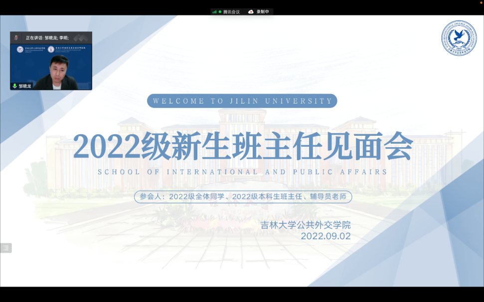 邹晓龙老师从“如何学习”“如何生活”“坚持自我”这三个方面向同学们提出了建设性意见。他指出,大学生活具有很强的自主性,希望同学们能充分发挥吉大这一优质平台的资源优势,结合时代发展与变化,合理规划每一阶段的目标,充分发挥主观能动性,将小我融入大我,有力诠释“世界眼光,家国情怀”的办学理念。接着邹老师鼓励同学们要多经历,多体验,多感受,“读万卷书,行万里路”,学会主动适应环境,注重自身的身心健康,并提醒同学们要注重礼仪,成为一名有素养的外交人。最后,邹老师强调需要坚持自身选择,大胆走好自己的人生道路。
