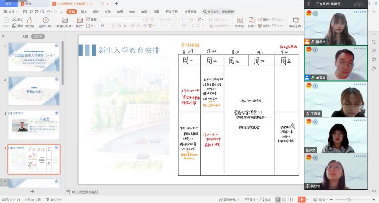 会议第一部分,辅导员单葆龙老师和辅导员助理向2022级新生做了简短的自我介绍。随后,辅导员老师向大家介绍了近期的新生入学教育安排,并从疫情防控、安全教育、防诈骗、行为规范等方面强调了新生注意事项。