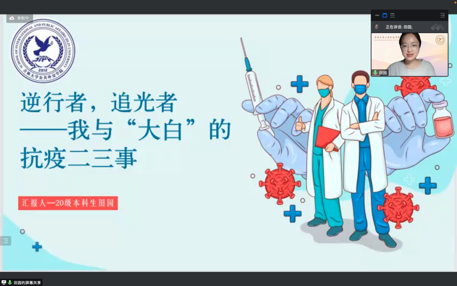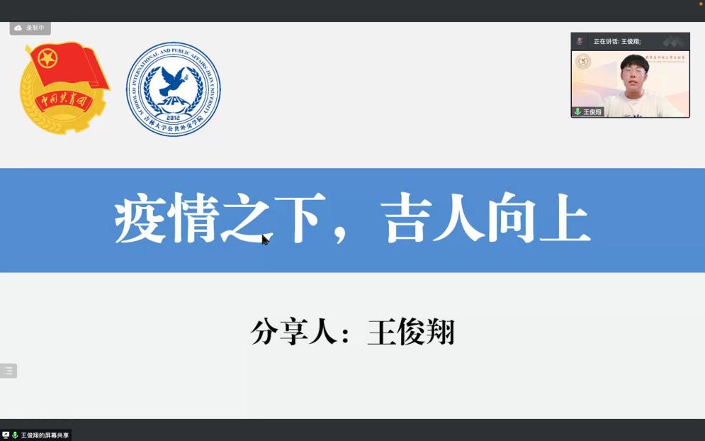 最后,王俊翔同学分享了他的抗疫故事。他说,作为共青团员,参加志愿者服务是他的责任。鲁迅曾言:“我们从古以来,就有埋头苦干的人,有拼命硬干的人,有为民请命的人,有舍身求法的人。”吉大人便是在实践中履行着这句话,疫情之下,吉人向上,作为一个吉大人他有着深深的荣誉感,而我们的吉大精神与吉大品格也正是在疫情磨砺下愈发深厚。