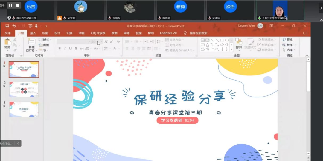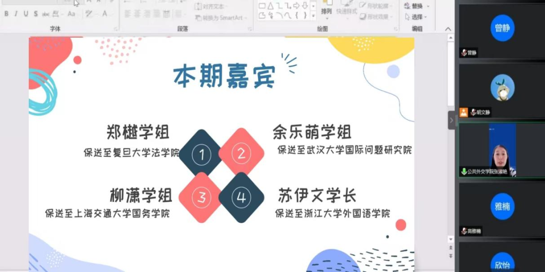 团委学生会学习发展部于10月14日晚组织开展了第三期“青春分享课堂”活动,邀请到了亚洲av2019级本科生郑樾、余乐萌、柳潇、苏伊文为大家分享保研过程中的心得体会。本期分享会由2021级本科生温乐言同学主持,学院辅导员张淑艳老师和各年级SIPAer们参加。