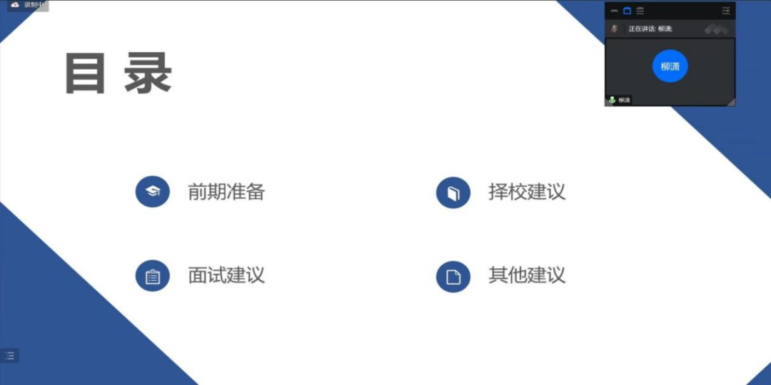 随后,柳潇同学给出了具体的择校和面试建议。在前期准备方面,她强调了个人陈述的重要性,提醒大家要注意细节,详实地进行描述;关于专业知识的积累问题,她则推荐了一些书籍,并强调大家平时一定要认真阅读专业课本,提升专业技能。在讲述了学生工作等经历带来的自我提升后,她以“低头赶路,敬事如仪;自知其心,其路则明”作结,希望大家放稳心态,停止内耗,一步一步踏实走下去。