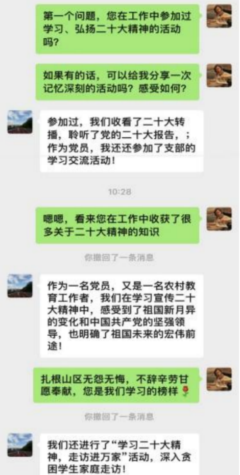 2023年2月7日15时,由郑含婷同学担任主持人,孟蕾同学担任宣讲人,实践团队通过腾讯会议组织展开了一次专题宣讲活动。宣讲队根据在线问卷的调查结果,从党的二十大主题、党的二十大报告具体内容、党的历史成就、未来发展规划以及中国式现代化等相关问题入手,通过宣讲活动解答了相关问题,增进了参会者对党的二十大相关精神以及内容的了解。