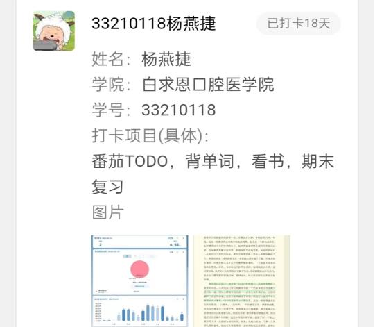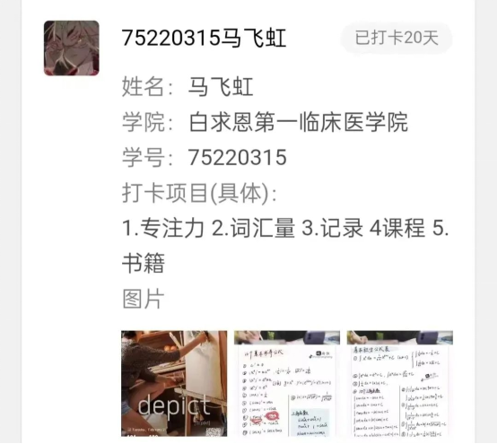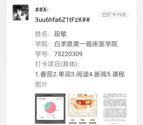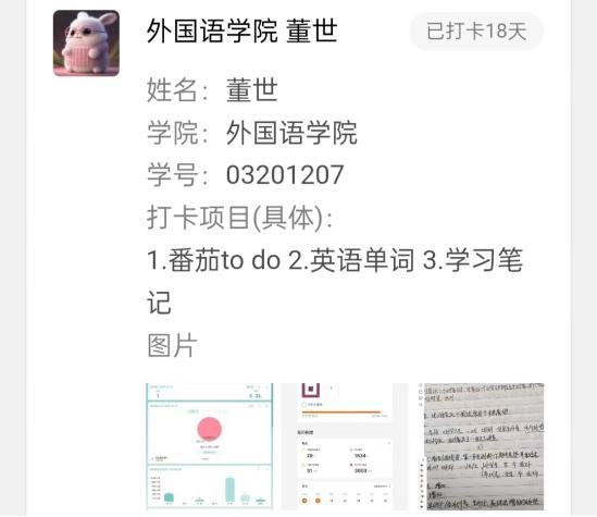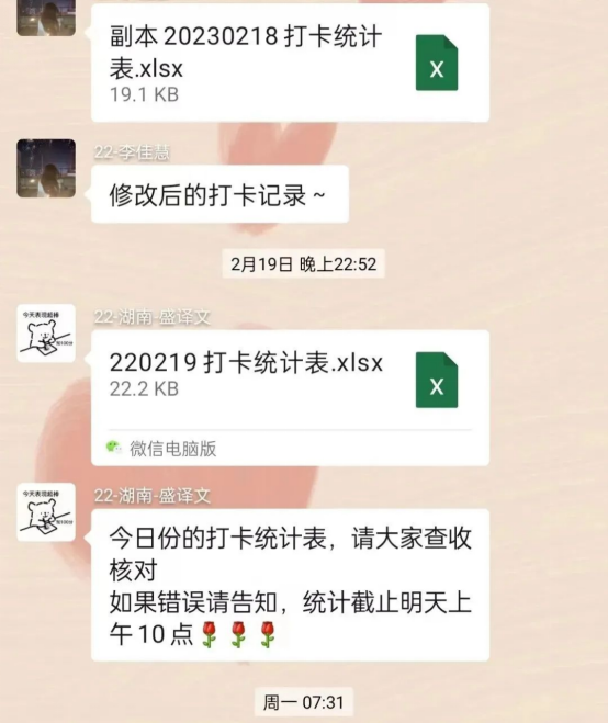 在二十一天打卡活动的助手工作中,我收获了很多。虽然有时统计数据会出错,工作也不是想象的那么完美,但在这样一种实实在在的持续学习的状态中,我感到充实。在每日打卡中,我们感受到新时代青年人的朝气与努力。在这21天里,我们互相勉励、互道早安、共同见证彼此的进步,期待下一次打卡活动的举行。
