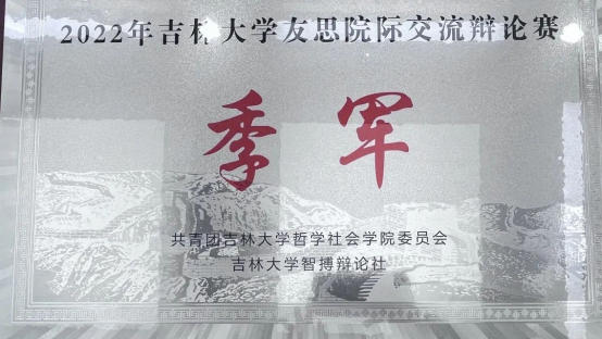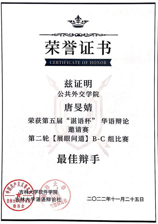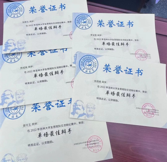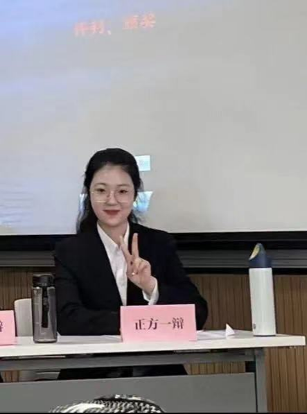 辩论赛是团队比赛,无论是团队成就还是个人成就的取得,都离不开四位辩手以及整个学院辩论队成员的共同努力。在友思备赛过程中,我们每个人都将课余时间利用到了极致,我们珍惜在一起进行思维碰撞的每一分每一秒,共同立论、改论,坚定自己的持方。作为一辩,我的任务主要是进行一辩稿的整理,为大家提供资料支持,这就需要我在讨论过程中认真聆听并及时记录大家的观点,在此过程中,辩论队成员出的模辩以及学长学姐的指导给予了我丰富的学习参考资料,使我实现了由一开始只会写地板论到以一辩的身份拿到佳辩的跨越式成长。在今后的过程中,我会继续精进自己的辩论技术,争取更好地进步。