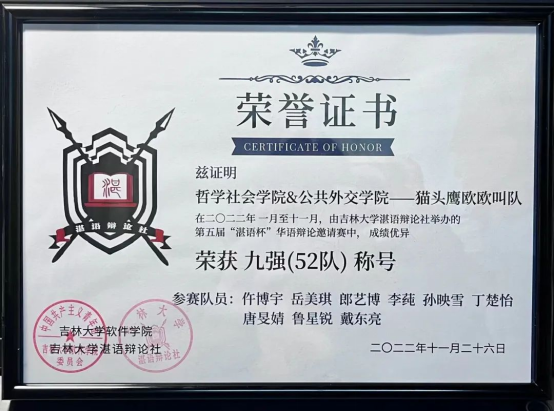 由SIPA辩论队和哲学社会学院组成的“猫头鹰欧欧叫队”取得了九强(52队)的成绩,由SIPA辩论队和计算机科学技术学院辩论队组成的联队也表现出色,其中唐旻婧同学表现优秀,获得了单场最佳辩手的荣誉称号。