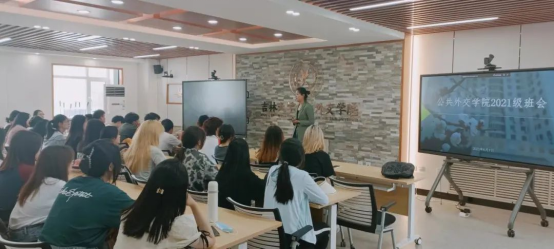 于吕振羽楼818会议室召开2021级班会。2021级1班班主任乔蕊老师、2班班主任刘雅姝老师、辅导员张淑艳老师及2021级全体本科生参加此次会议。