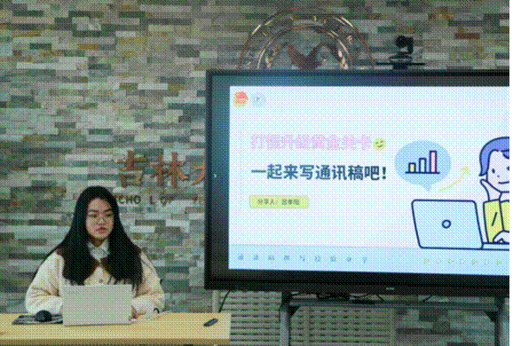 吕孝阳就通讯稿写作方法与同学们进行了交流分享。她从通讯稿的基本要求、分步撰写、案例实操、写作技巧四个方面出发,结合具体通讯稿案例,为同学们展示了通讯稿写作的基本要领。她强调,通讯稿的字体要求、措辞规范、语句美化三点至关重要。她以具体的通讯稿为示范案例,带领同学们共同修改语句、措辞等,展现了高质量通讯稿的写作过程。最后,她为大家推荐了实用的写作APP和公众号,鼓励同学们积累素材,丰富文章结构与内容,将学习成果转化为工作的强大动力。