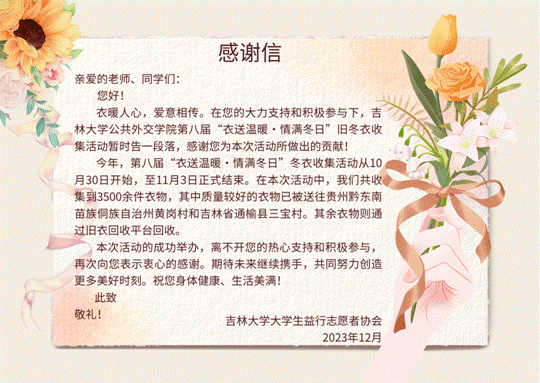 寒冬如期而至,我们心怀温暖,愿将这份温情传递,驱散远方的寒冷。诚挚感谢各位老师和志愿者对活动的鼎力支持,也衷心感谢所有慷慨捐赠衣物的师生!本次活动虽已落幕,然爱与温暖的故事永不谢幕。期盼明年能再次与大家相聚,共同书写新的温馨篇章!