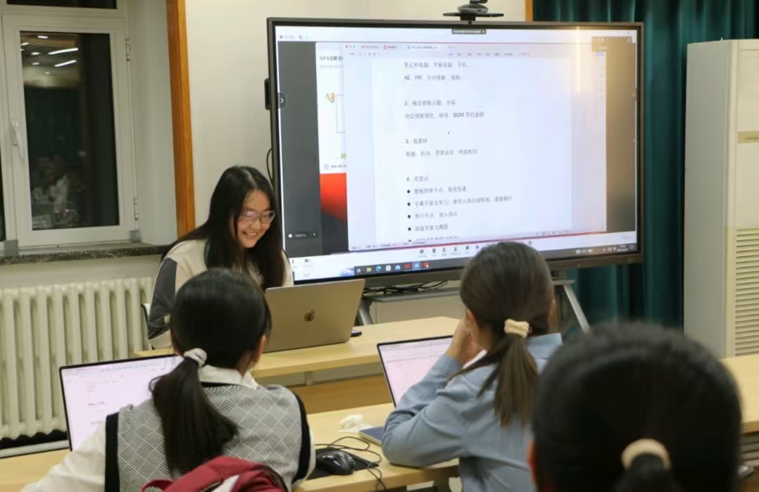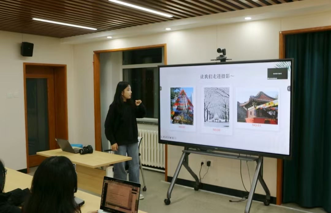 接着,牛艺萱同学为大家详细介绍了摄影技巧和海报制作流程。她从摄影知识入手,通过图文并茂的方式,带领大家了解相机的各个部件的功能及使用方法,分享图片构图、光线运用等摄影技巧,并详细介绍了照片导出、相机充电及归还流程,帮助同学们规范使用相机设备、拍摄精美作品。在海报制作方面,她借助“可画”设计平台,展示海报制作的各关键要素构成,鼓舞大家同步操作,在实践中积累工作经验。