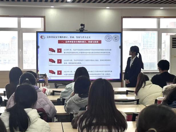从“十个坚持”和“五个统筹”引入,杜美羲向同学们讲述了总体国家安全观的科学内涵。通过讲述总体国家安全观的全面、系统、统筹、可持续性等基本特征,同学们丰富了自身知识储备,对总体安全观有更全面的认识。
